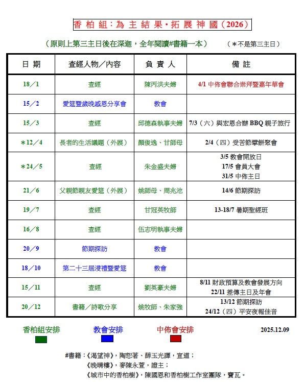 - 閱讀書籍‧豐富靈命:每年齊齊閱讀一本屬靈書籍,組員創意無限,透過多元的方式分享,包括文字、現場、錄音、錄影等,彼此造就。